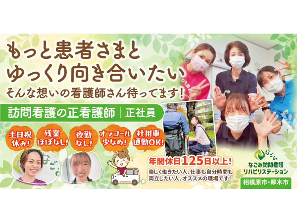 【本厚木駅より徒歩9分】安定したリズムで働きたい/夜勤のない職場で働きたいという方、一緒に〈訪問看護〉の仕事をやってみませんか?年間休日125日以上!土日祝休み!残業ほぼなし!