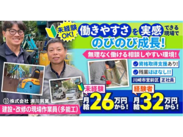 【株式会社 瀬川興業】未経験OK◎スキルを身につけられる建設・改修の現場作業員(多能工)|《正社員》募集【川崎市宮前区の求人】