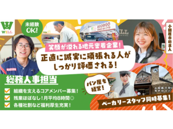 【株式会社ウィル】自動車販売/整備・ベーカリー経営企業の総務人事担当《正社員》の募集【小田原市の求人】